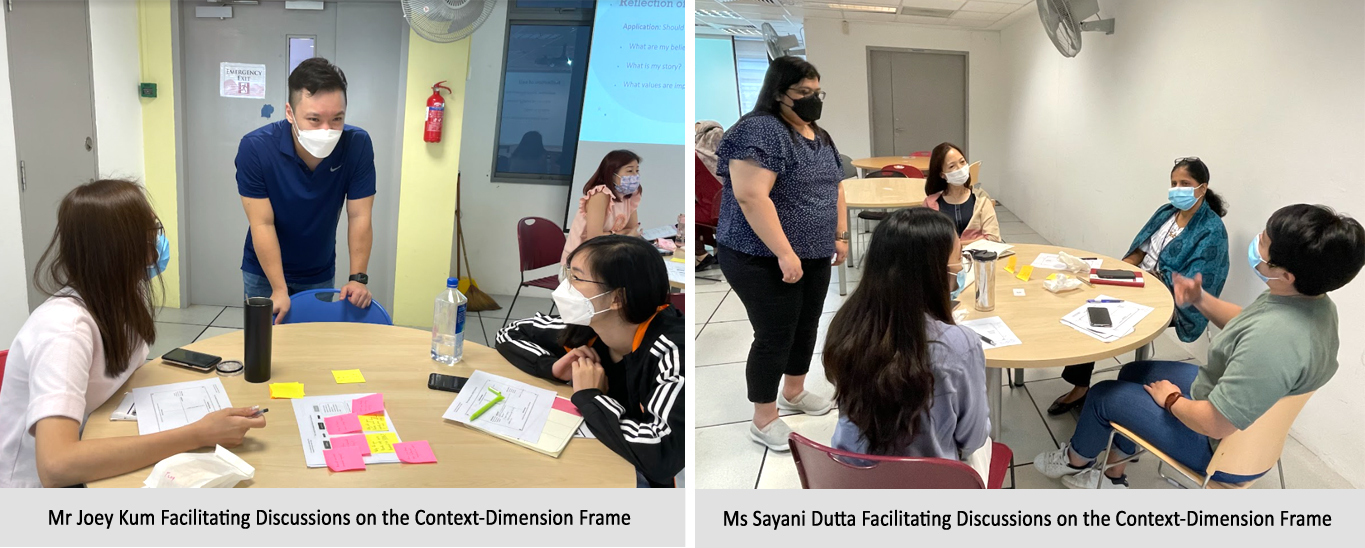 On 26 and 27 January 2022, TMJC conducted our very own in-house professional development workshop, which focuses on sharpening our teachers’ facilitation skills to create greater intellectual, affective, and experiential engagement for our students in CCE lessons. During the workshop, teachers examined how “Clarifying”, “Sensitising” and “Influencing” questions could be employed to facilitate the discussions on contemporary issues with students. Thereafter, teachers also had the opportunity to explore the use of the Context-Dimension Frame to promote dialogic teaching in the classroom, with the aim to engage our students in critical thinking and open discourse, and encourage active participation through the sharing of multiple perspectives.