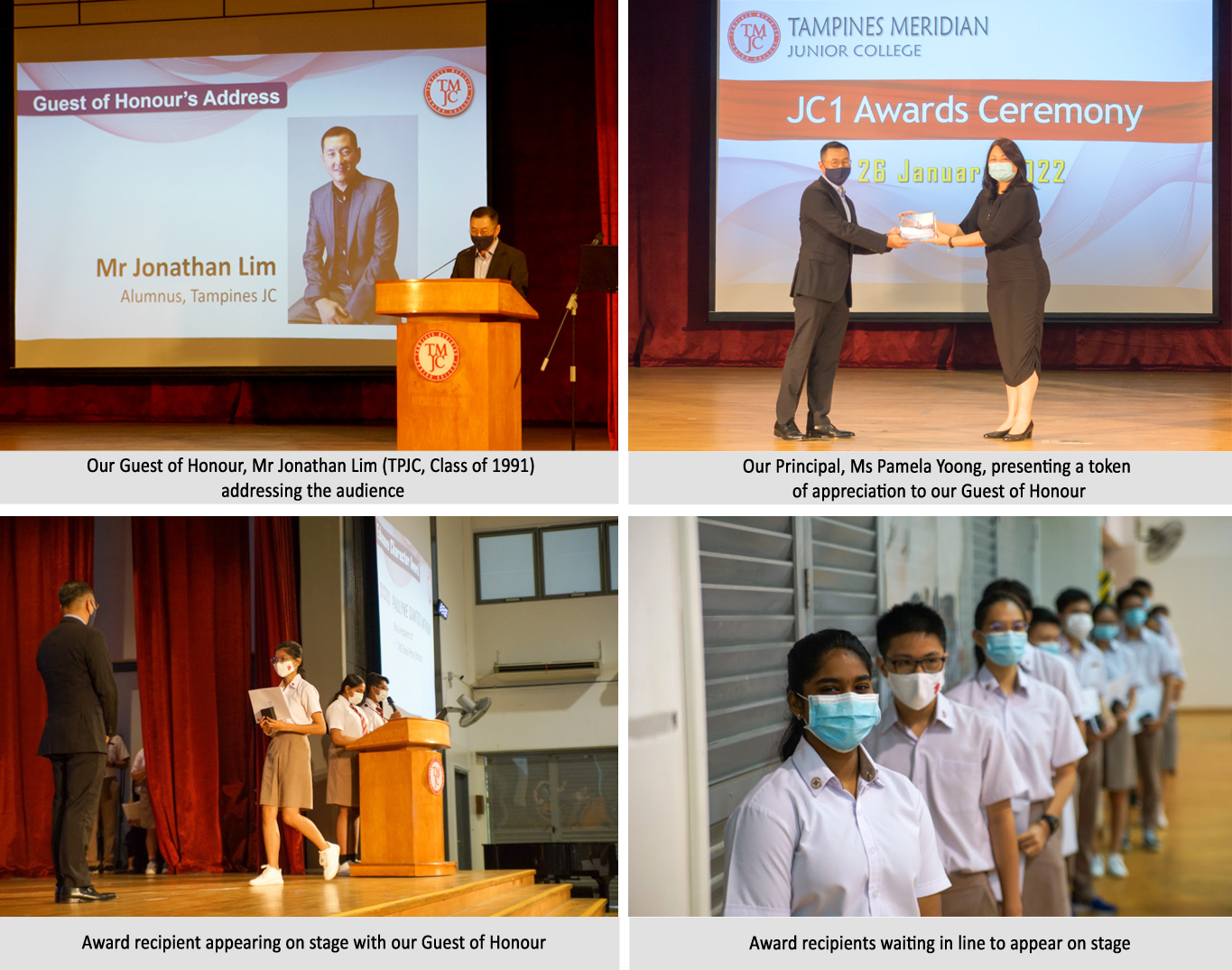 Our Guest-of-Honour, Mr Jonathan Lim, an alumnus of one of our parent colleges (Tampines JC), motivated the cohort with his opening address and presented the MOE Edusave Character Award as well as the TMJC Alumni Scholarship to deserving students.
