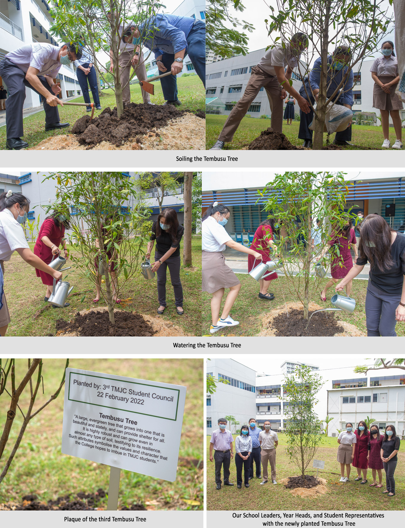 The Tembusu Tree-Planting Ceremony is a tradition TMJC started in 2020, as it commemorates the shared experiences and achievements of each cohort of students. The Tembusu Tree is chosen as it is a large, evergreen tree that matures with stately beauty, and can provide shelter for all. It is highly robust and can grow in almost any type of soil, testifying to its resilience. Such attributes symbolise the values and character that the College hopes to imbue in TMJC students.