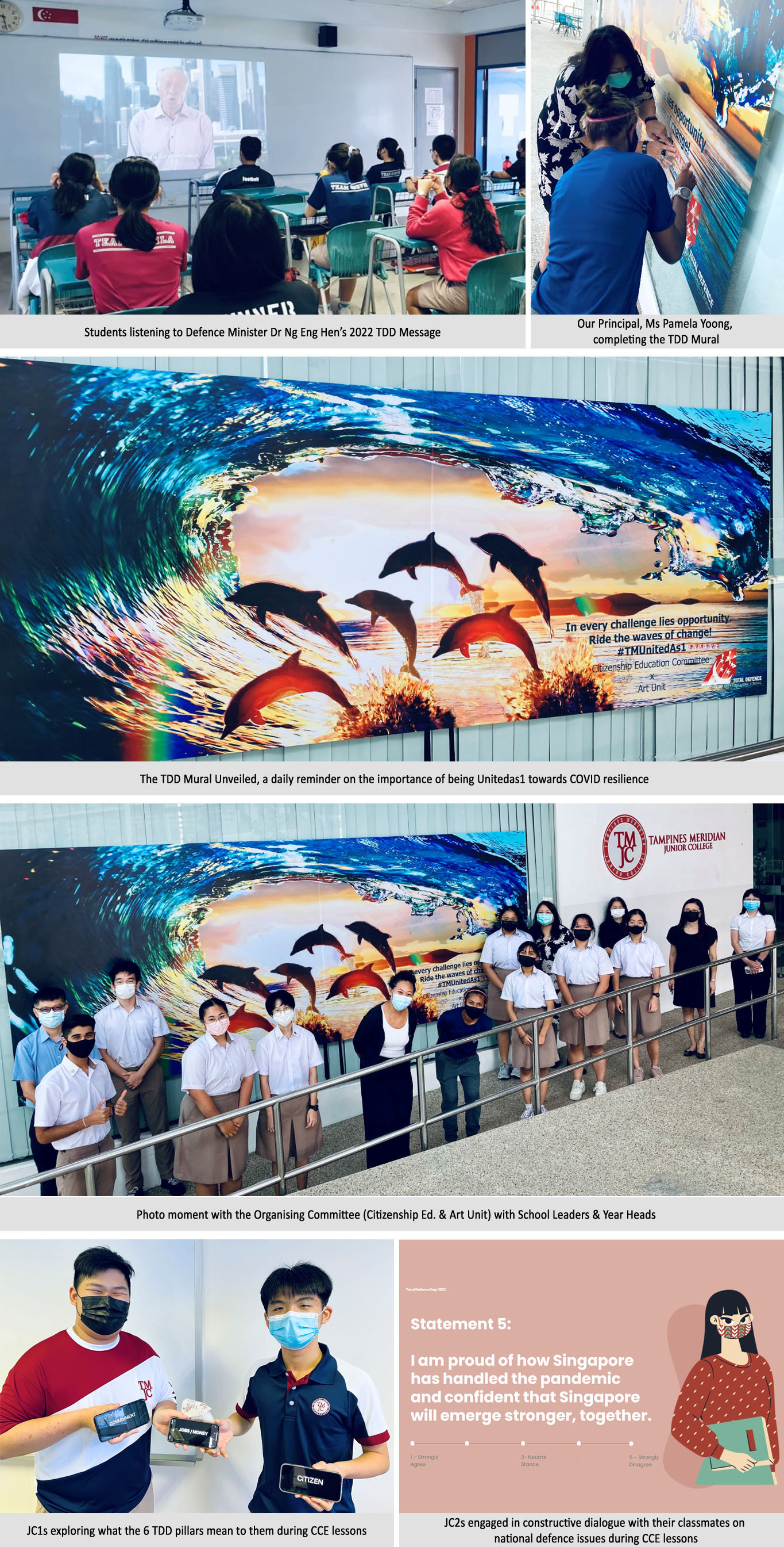 Amid Singapore’s transition towards COVID resilience, the significance of the day becomes more pronounced. In light of this, during their Character & Citizenship Education lessons, students took perspective, discussed what Total Defence meant to them and learnt about the role they can play in Singapore’s national defence. The commemoration culminated in a mural display outside the General Office, a collaboration between the Citizenship Education Committee and the Art Unit. The Total Defence Mural functions as a daily visual reminder to all TMJC students on the importance of being united and adaptable in Singapore’s journey towards living with COVID.