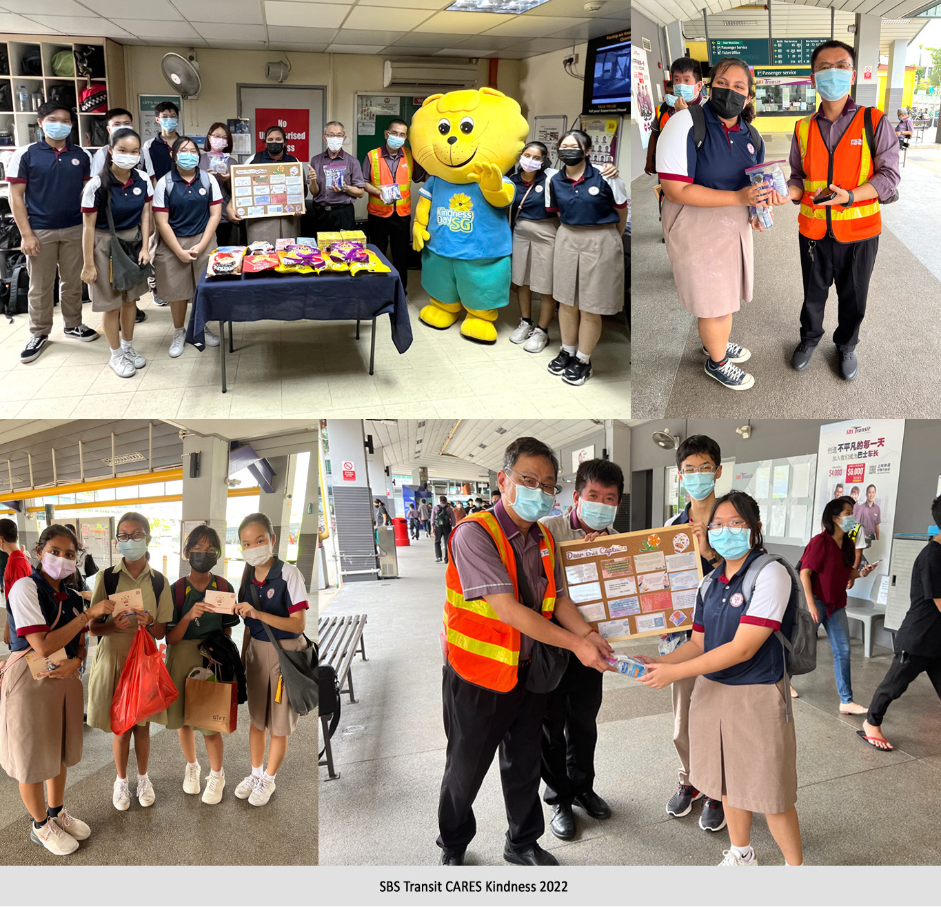 On 27th May 2022, in conjunction with SBS Transit CARES Kindness Month, students from the Interact Club designed a postcard to give to members of the public to promote kindness towards bus captains. The students also prepared an appreciation board, care packs and set up a welfare corner for the staff working at Tampines Bus Interchange and the Tampines Downtown Line MRT Station. The students were glad to have the opportunity to interact and personally express their gratitude to the bus captains.