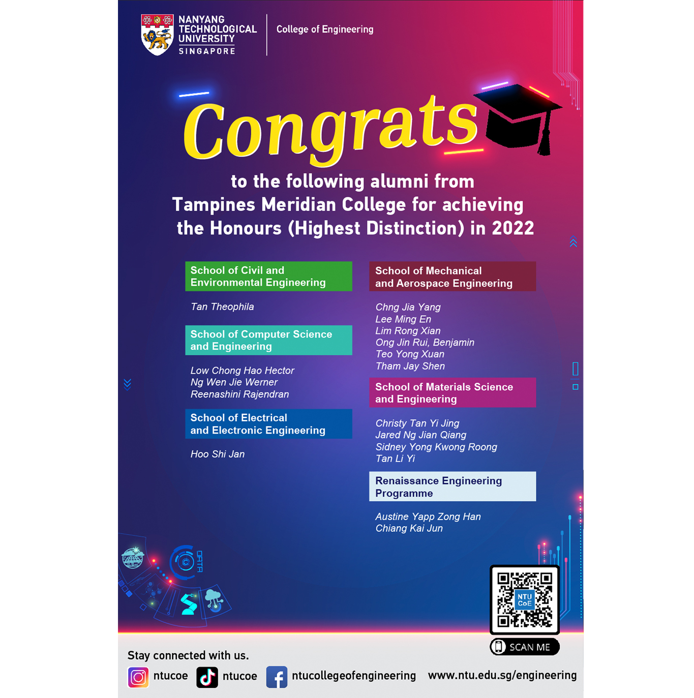 The College is immensely proud of our TMJC alumni who have excelled and attained Honours (Highest Distinction) from the NTU College of Engineering Class of 2022. They have done exceptionally well despite all odds during the pandemic and we are truly proud of their accomplishments and resilience.