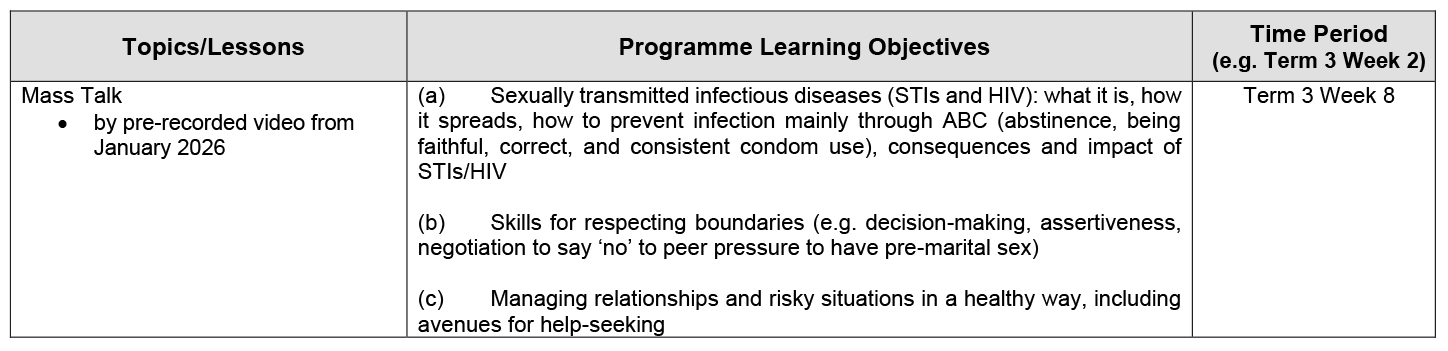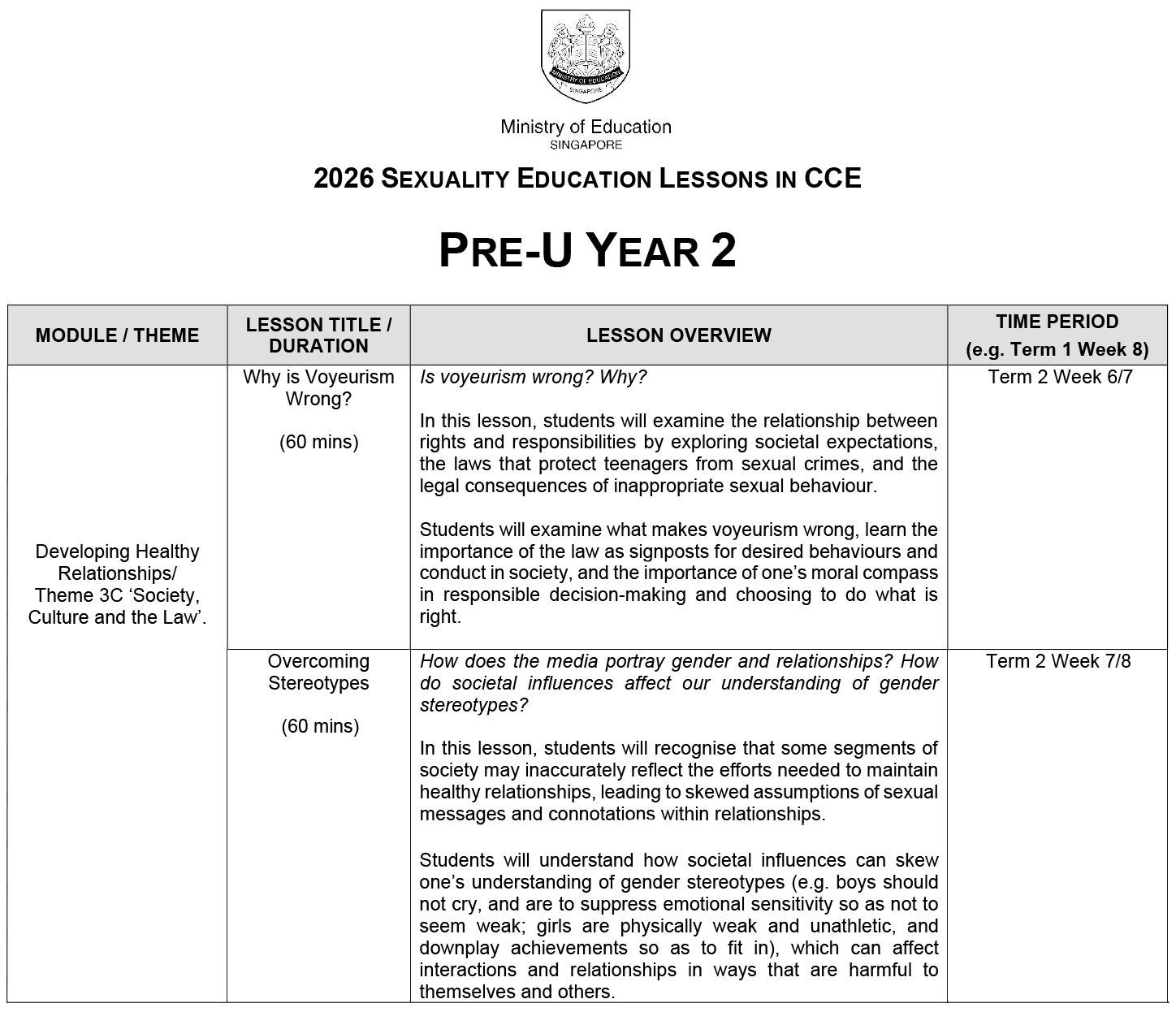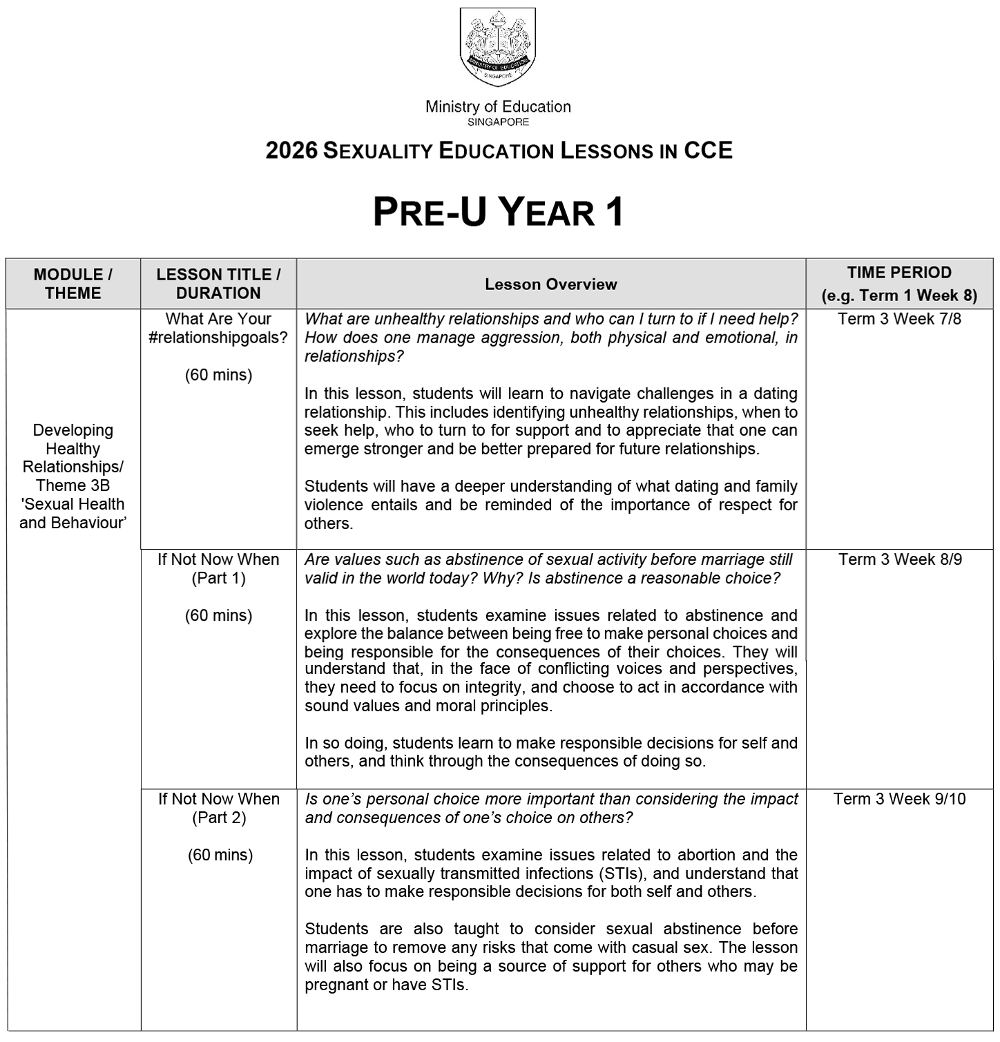 At Tampines Meridian Junior College, the following Sexuality Education lessons will be taught in 2026: